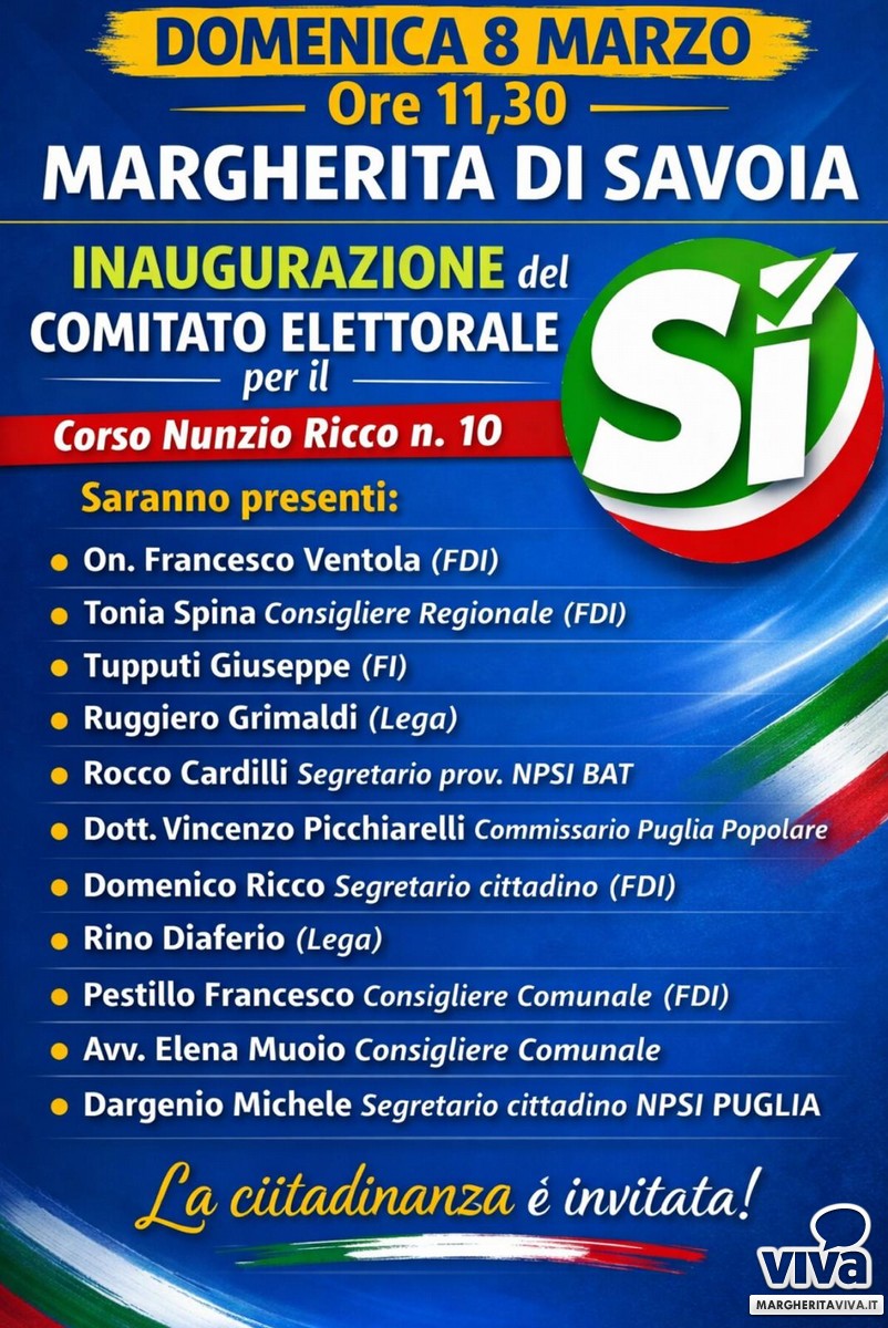 Domenica 8 marzo alle ore 11:30 vi aspettiamo a Margherita di Savoia, in Corso Nunzio Ricco n.10, per l'inaugurazione del Comitato per il SÌ. All'incontro prenderanno parte esponenti politici locali e rappresentanti istituzionali del territorio, tra cui la Consigliera Comunale Avv. Elena Muoio e il Consigliere Comunale Francesco Pestillo.