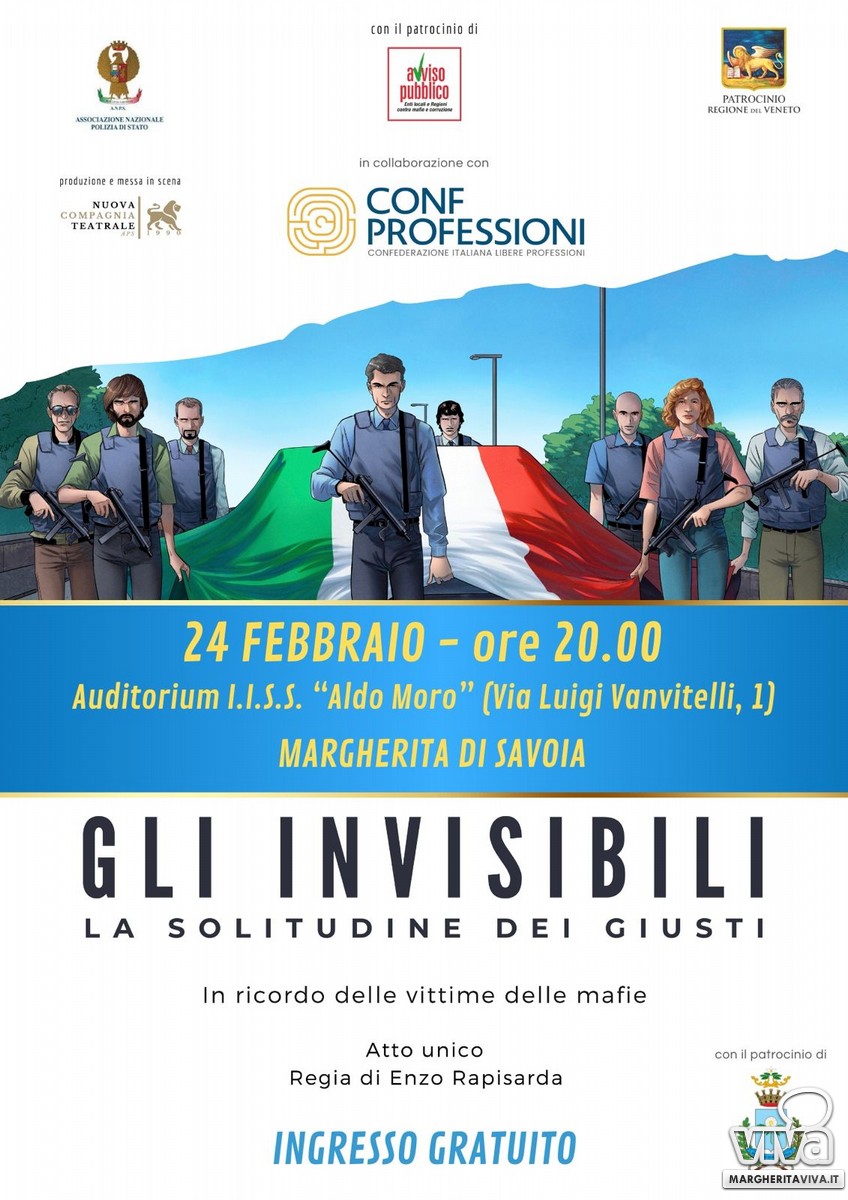 L'Auditorium dell'I.I.S.S. "Aldo Moro" sito in Via Vanvitelli n. 1 ospiterà martedì 24 febbraio 2026 lo spettacolo teatrale "Gli Invisibili – La solitudine dei giusti", atto unico con la regia di Enzo Rapisarda in ricordo delle vittime delle mafie. Gli Invisibili sono le donne e gli uomini delle scorte, caduti negli agguati di mafia di cui non costituivano il bersaglio ma un obiettivo secondario, un danno collaterale di scarsa importanza nella mentalità mafiosa. Invisibili ma non per questo meno eroici dei simboli della lotta alla mafia, con cui condividevano la loro quotidianità.