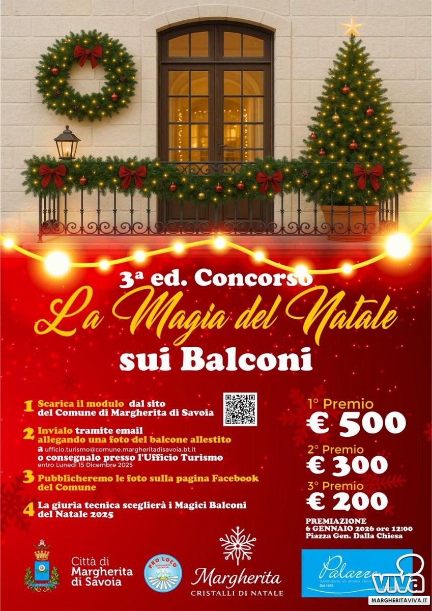 Anche quest'anno a Margherita di Savoia l'atmosfera natalizia prende vita con terza edizione del concorso "La Magia del Natale sui Balconi", un'iniziativa pensata per valorizzare la creatività dei cittadini. Il contest invita i partecipanti ad addobbare il proprio balcone con decorazioni luminose, ghirlande.