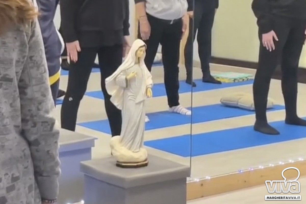 «Il tema del terzo giorno della novena in preparazione alla festa dell'Immacolata è: con Maria in cammino per ricucire le nostre relazioni. Abbiamo quindi scelto come luogo dove vivere questa celebrazione, la palestra, in cui si pratica l'esercizio fisico per stare bene con il nostro corpo e con la nostra anima. Il nostro compito oggi è quello di ricucire le relazioni, ma per farlo abbiamo bisogno anche di ricucire il corpo, di farlo rilassare, per poter vivere le giornate in maniera positiva e tranquilla. Quindi oggi vogliamo affidare a Maria il nostro cammino, perché così come una mamma, anche lei ci possa prendere per mano», spiega Don Michele Schiavone.