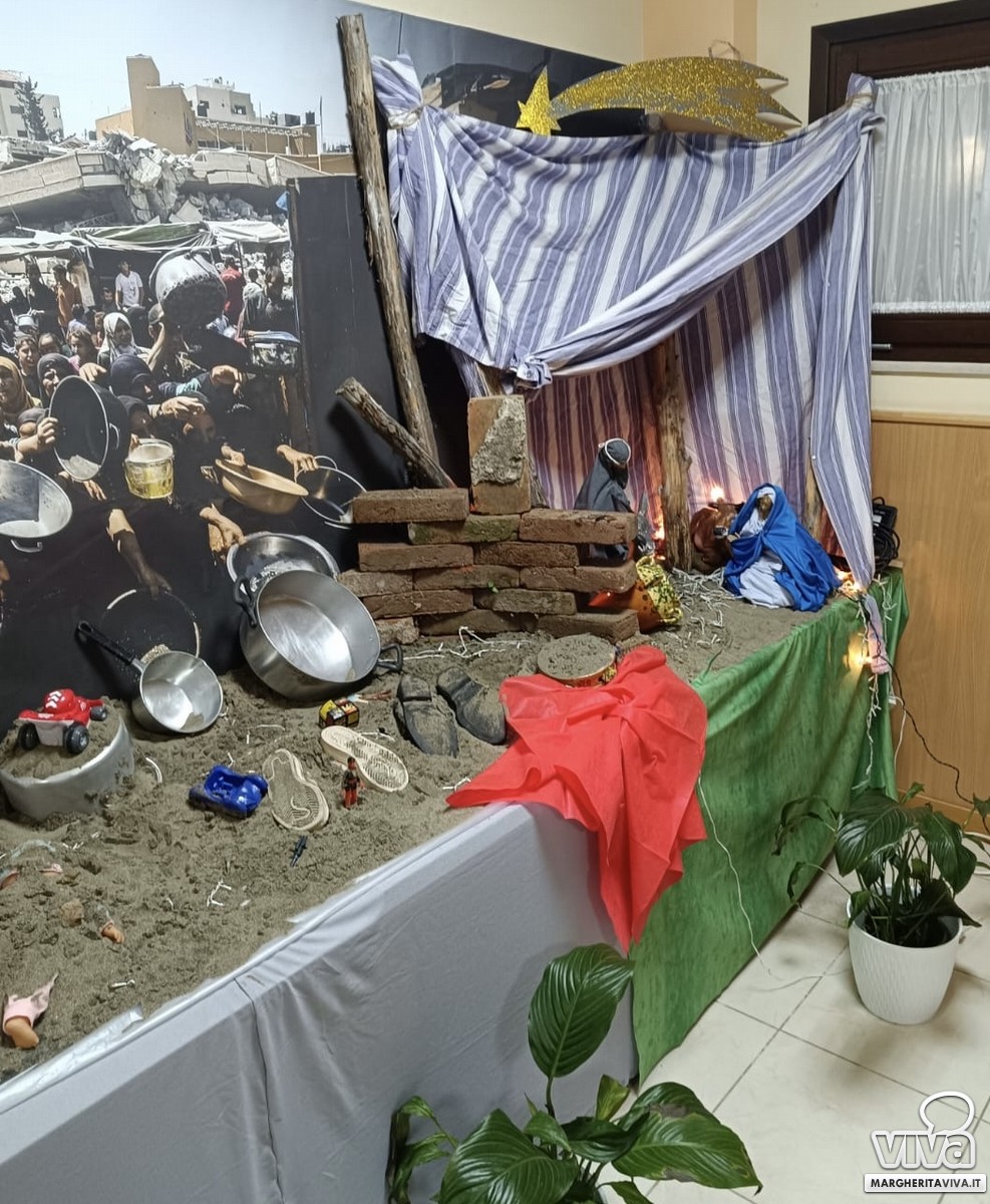 Il presepe, ideato dalla Caritas della parrocchia di Maria Santissima Addolorata di Margherita di Savoia e supervisionato dall'architetto Franco Torraco, ha come sfondo le distruzioni della guerra nella striscia di Gaza (ma potrebbe essere qualsiasi teatro di conflitto nel mondo) ed accoglie la Sacra Famiglia.