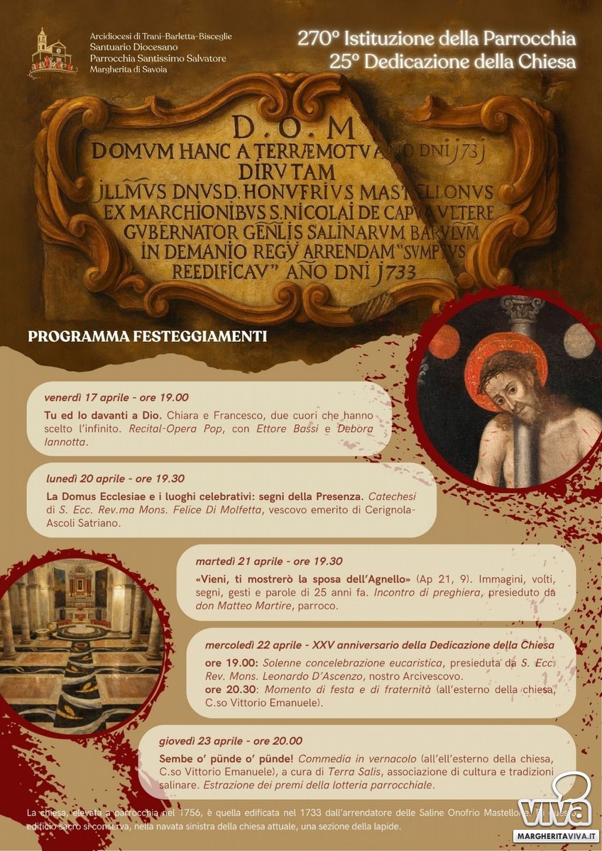 Il 22 aprile prossimo la parrocchia del Santissimo Salvatore celebra due anniversari straordinari: i 270 anni dall'istituzione della prima parrocchia salinara (1756), attestata dall'avvio dei registri dei battesimi, matrimoni ed esequie, e i 25 anni dalla Dedicazione della Chiesa (2001), al termine dei radicali lavori di adeguamento architettonico-liturgico del presbiterio e della pavimentazione.