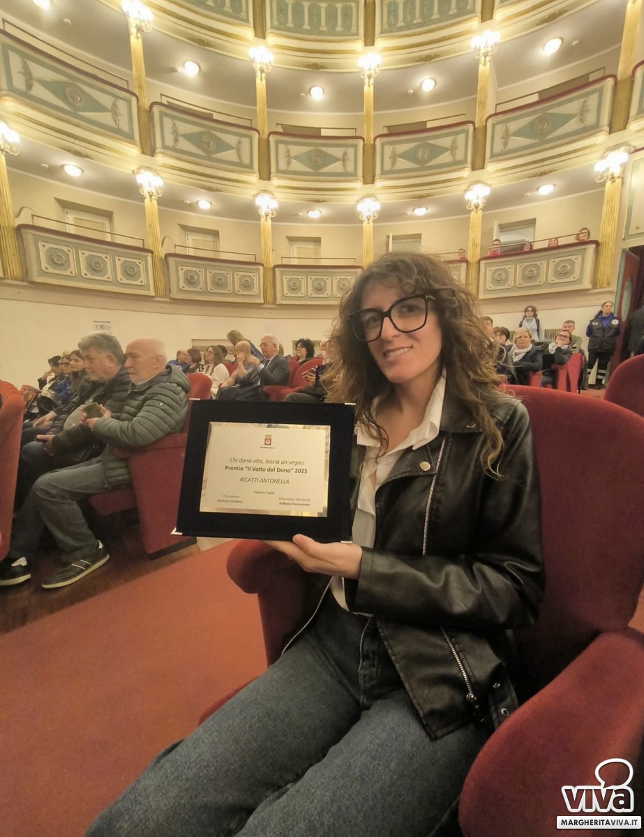 Tra i premiati, selezionati dalla Regione Puglia, c'è anche Antonella Ricatti, una giovane di 25 anni residente a Margherita di Savoia, donatrice di sangue e di midollo osseo, che è stata premiata dall'assessore regionale alla sanità della Regione Puglia, Raffaele Piemontese.