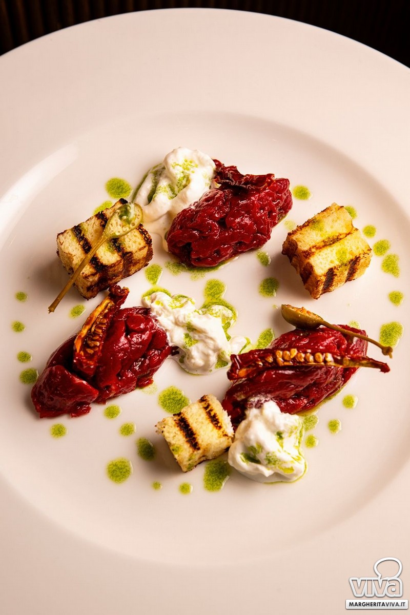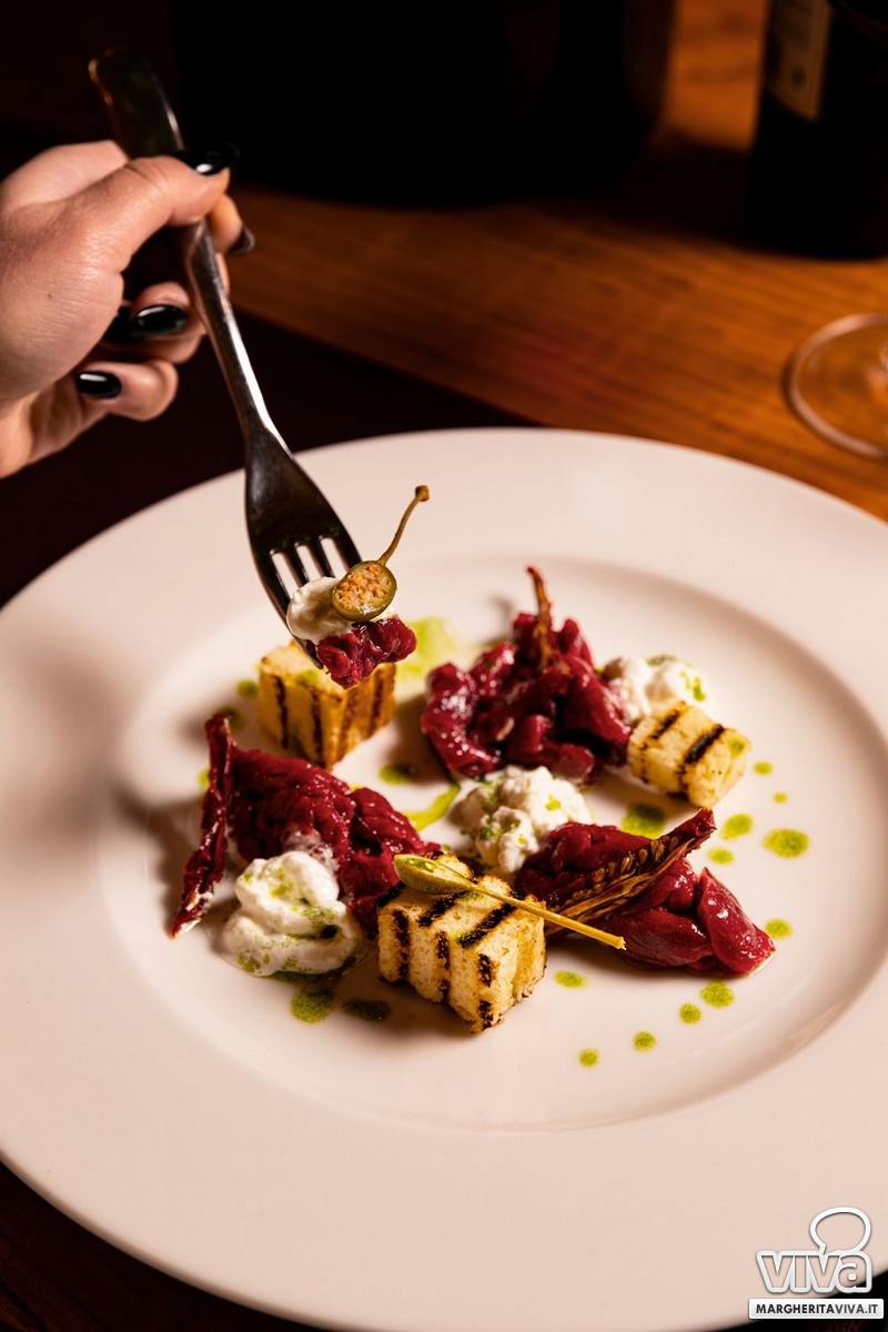 La proposta gastronomica è costruita con cura e attenzione. Si parte da piccole sfiziosità, ideali per accompagnare il vino, per poi arrivare a piatti più strutturati, con un menù che spazia con naturalezza tra terra e mare, con combinazioni pensate per incuriosire e per lasciarsi abbracciare da un buon calice scelto con attenzione.